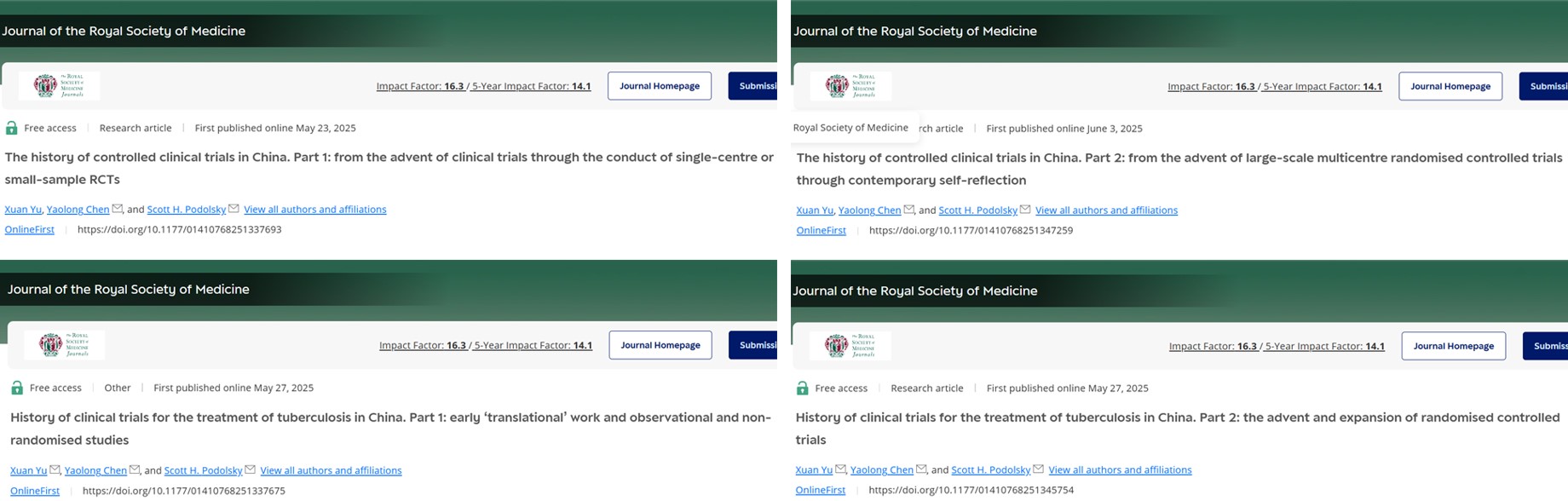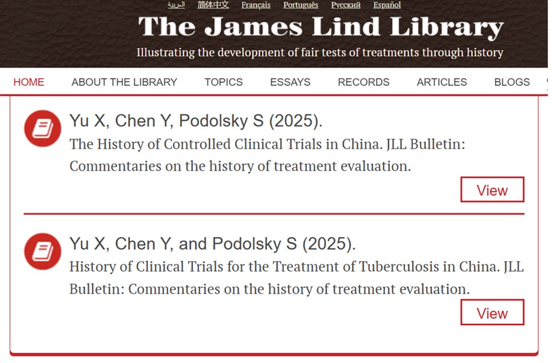 近日,兰州大学基础医学院循证医学研究所与哈佛大学医学院全球健康与社会科学系合作,在英国皇家医学会的会刊《Journal of the Royal Society of Medicine》发表了四篇系列论文,系统回顾和梳理了20世纪40年代至21世纪初我国临床试验的发展历程。该系列研究填补了中国临床随机对照试验发展史研究领域的空白,还因其学术价值与方法学贡献,被国际知名的詹姆斯·林德图书馆(James Lind Library)收录。这是该图书馆首次收录由中国学者主导的医学史研究系列论文,标志着我国在临床试验发展史研究领域取得重要成果。